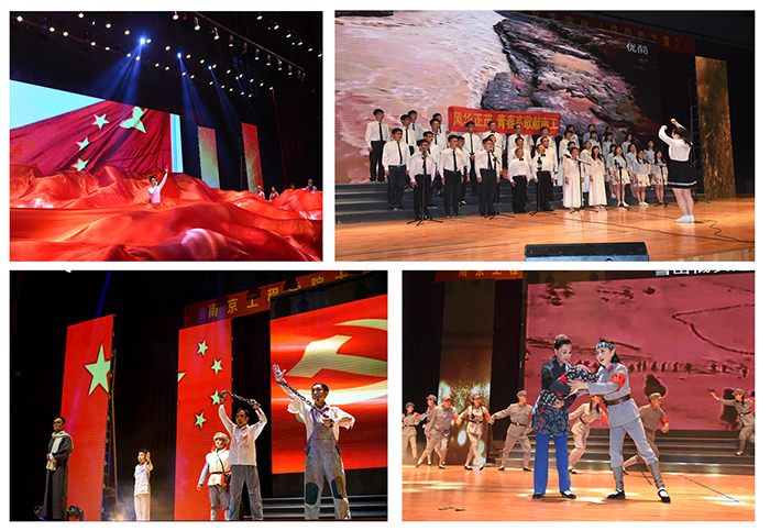 大气磅礴的音诗画《你是一面旗帜》为整场演出拉开了帷幕;九三学社春之声教授合唱团和我校学生们共同演唱的大合唱《保卫黄河》,慷慨激昂,形象地刻画了游击健儿为保卫黄河、保卫全中国而战斗的壮丽场景;舞台诗《热血忠魂》向观众们展现了共产党人的大无畏精神和革命情操;《过雪山草地》、《映山红》再现长征情景,弘扬长征精神;创作歌舞《红军老妈妈》以一颗红心表达了坚定的爱国情怀;《红军哥哥你慢走》充满红色记忆,仿佛把人们带回那红色的年代,让更多的人记住红色的井冈山,记住许许多多为革命献身的红军先烈;舞蹈《茉莉花与新四军》在轻柔中透出一丝红色的历史;京剧片断《沙家浜》展现了一个沉着冷静,机智灵敏的阿庆嫂;歌舞表演《奔赴新战场》和《新四军军歌》,以昂扬振奋的旋律,威武雄壮的气势,表现了新四军一往无前的战斗精神。