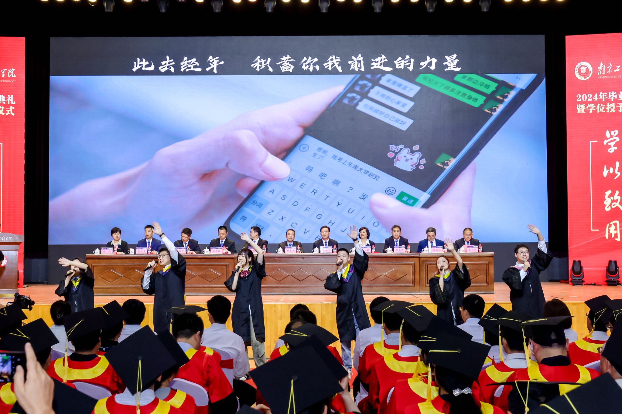 典礼现场气氛热烈,毕业微电影《地球是圆的》与大家一同回顾了大学期间的点点滴滴,歌曲快闪《小美满》《凤凰花开的路口》《落叶归根》《你曾是南工程少年》《明天会更好》,轻快悠扬的旋律带动起同学们的心灵共鸣,燃起了现场的欢呼与热潮。毕业生代表还向物业、后勤、保卫人员代表献花,感谢他们给予的关怀、帮助。庄重而又暖心的仪式感,引导毕业学子常念感激之情、常怀感恩之心。典礼还开设了全程图片直播,浏览量达16万余人次。