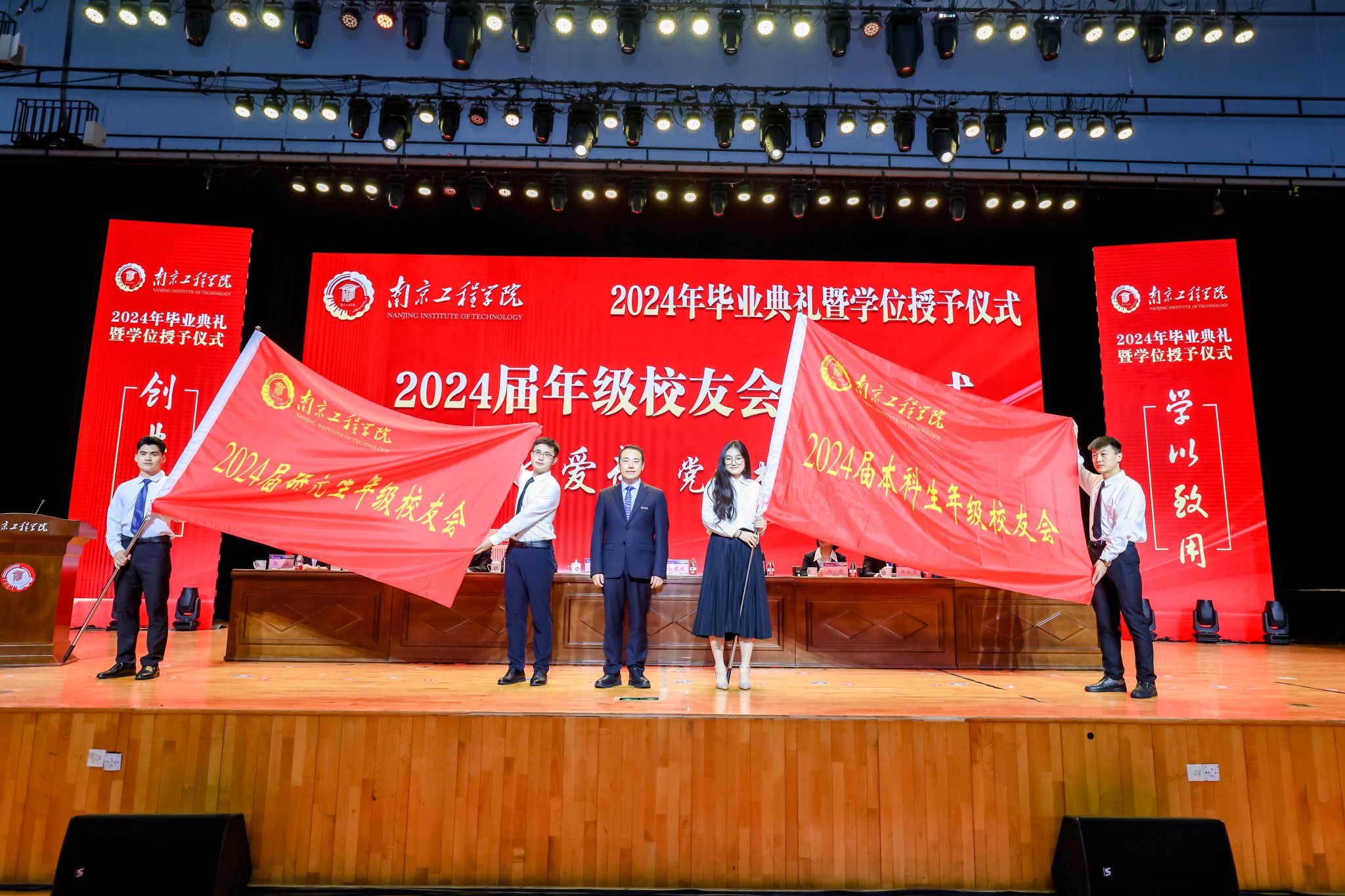 活动现场还举行了2024届年级校友会授旗仪式。党委书记孙爱武为2024届研究生年级校友会、本科生年级校友会授旗。