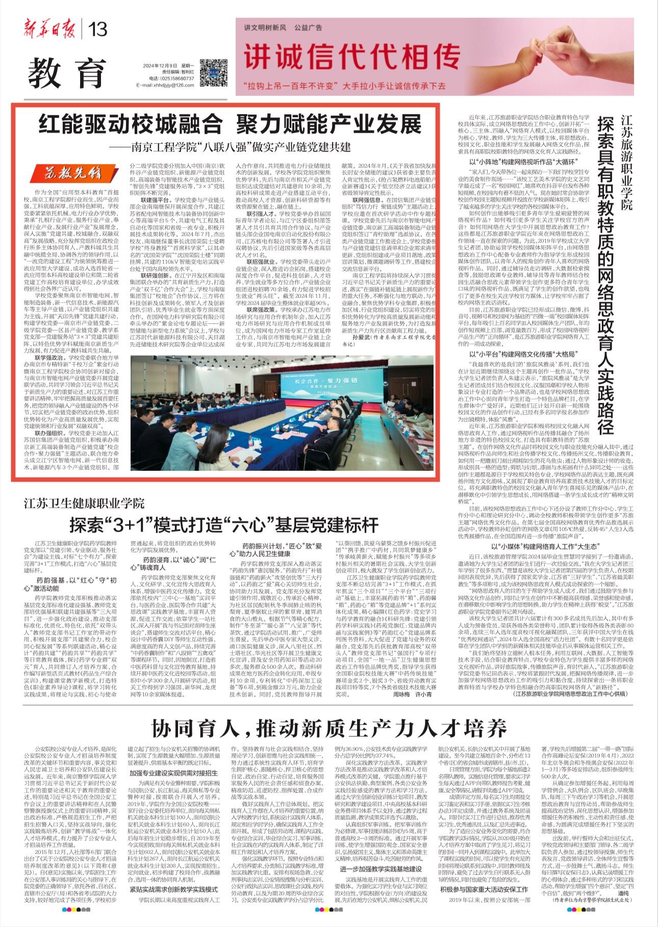 12月9日,《新华日报》刊发我校党委书记孙爱武题为《红能驱动校城融合 聚力赋能产业发展——凯发k8官网“八联八强”做实产业链党建共建》的署名文章。文章围绕习近平总书记提出的“在强链补链延链上展现新作为”的重大任务要求,从“联学强政治”“联办强组织”“联建强平台”“联研强创新”“联引强人才”“联招强就业”“联席强政策”“联网强信息”八个方面,介绍了凯发以产业链党组织共建为主线,促进产教科城共生共融的具体举措与工作成效。