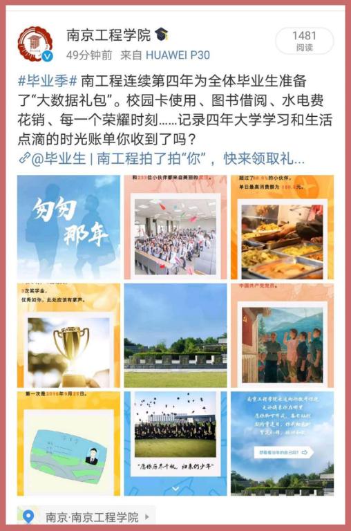 “2016年9月,你背起行囊,跨越253公里,从苏州来到南京,新的旅程扬帆起航”“有点小迷糊的你,一共补办了2次校园卡”“优秀的你,一共参加2次科创活动,获得过1项专利,1次一等奖学金,此处应有小红花”……这已经是凯发连续第四年为全体毕业生准备“大数据礼包”了。校园卡使用、图书借阅、水电费花销、每一个荣耀时刻……离校当天,记录四年大学学习和生活点滴的时光账单,发送到了每名毕业生的手机上。国贸162杨婷岚看到这份账单就泪目了:“大学四年的点点滴滴就好像昨天刚发生的一样,感谢母校如此用心的礼物。”