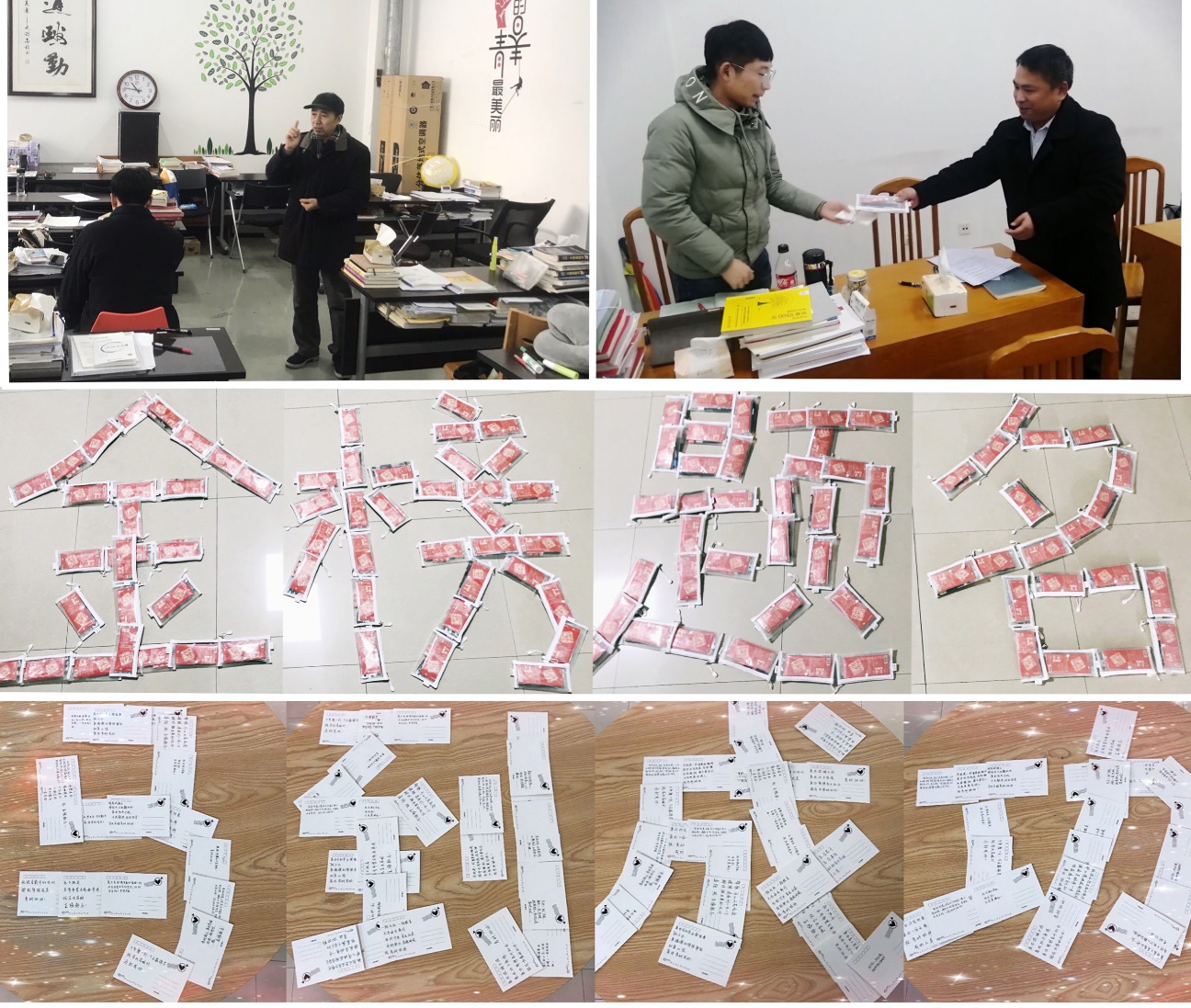 12月22日,经济与管理学院党委书记、副院长冯永伟,党委副书记、副院长管明清带领学工办老师一行,走进经管院考研教室,为正在紧张备考冲刺的同学们送去文具福袋和祝福明信片。文具福袋内为考研学子提供了考试必备的黑色签字笔、铅笔、橡皮、尺等必备文具,表达了学院对同学们考研“笔”胜、逢考“笔”过的祝福。随文具福袋一并带给同学们的是字里行间满是暖心话语的明信片,体现出学院领导对考研学子真挚的关怀。